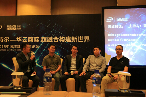 圓桌論壇環(huán)節(jié)(從左至右:主持人游峰;南大通用數(shù)據(jù)庫一體機產(chǎn)品總監(jiān)王傲雷;新華三集團云計算產(chǎn)品線總工盧國強; 戴爾亞太區(qū)企業(yè)級解決方案部存儲產(chǎn)品線業(yè)務經(jīng)理楊明;ZStack創(chuàng)始人張鑫)