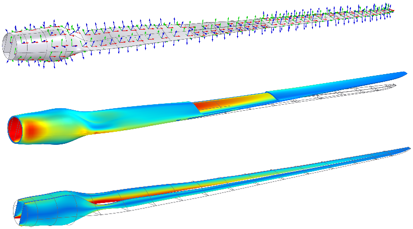 風(fēng)力發(fā)電機(jī)葉片的復(fù)合層壓結(jié)構(gòu)分析。從上到下:殼局部坐標(biāo)系,外殼與翼梁中的 von Mises 應(yīng)力分布結(jié)果圖。