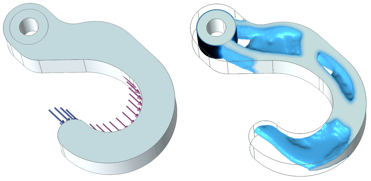 鋼制掛鉤的拓?fù)鋬?yōu)化,仿真根據(jù)不同的載荷工況,確定相應(yīng)的最佳材料分布。