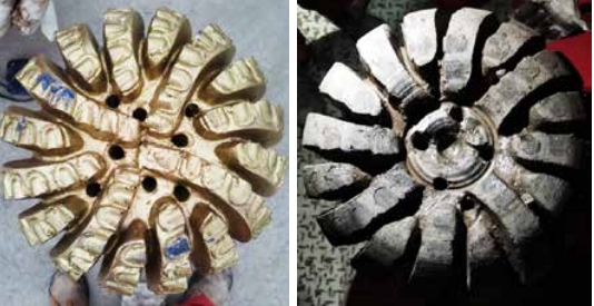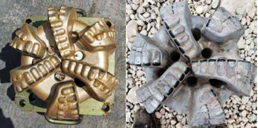 圖2 孕鑲鉆頭出入井對(duì)比圖(左:入井前;右:出井后)