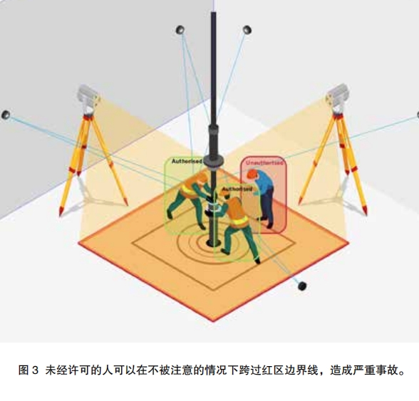通常用于跟蹤人員和帶電機(jī)械的運(yùn)動的人類觀察員可能受到外界影響而錯過關(guān)鍵動作。視線可能會被阻擋,觀察者可能會分心,或者未經(jīng)授權(quán)的人,如圖3所示,可能會在不被注意的情況下跨越紅區(qū)邊界,所有這些都可能導(dǎo)致嚴(yán)重的事故。如果行動沒有被跟蹤,人員可能會直接進(jìn)入火線。HaloGuard紅區(qū)管理系統(tǒng)捕捉指定區(qū)域內(nèi)的所有活動,成為取代傳聞和意見的數(shù)字真相機(jī)器。通過識別一組3D坐標(biāo)的攝像頭,可以實時確定人員的位置,后將其與來自可穿戴傳感器的信息進(jìn)行比較。該系統(tǒng)還被編程為區(qū)分那些被授權(quán)和未被授權(quán)進(jìn)入“紅區(qū)”的人。如果沒有找到匹配,則意味著在指定區(qū)域中有未授權(quán)的人。該系統(tǒng)將立即通知地區(qū)當(dāng)局,并允許采取必要的行動,確保只有正確的人員在現(xiàn)場。如果事故確實發(fā)生,在事故調(diào)查過程中,準(zhǔn)確記錄人員移動尤其重要,因為事實會被記錄下來。數(shù)字化監(jiān)控工具的回放功能可以用來建立和澄清準(zhǔn)確的事件鏈。然后,該系統(tǒng)能夠為調(diào)查中最重要的問題提供答案:誰、何時、何地和什么事。在數(shù)據(jù)分析之后,可以在整個行業(yè)中進(jìn)行學(xué)習(xí)和分享,以確保防止類似事件的發(fā)生。