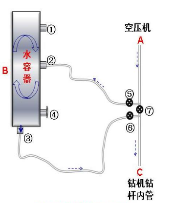 鉆井介質(zhì)切換裝置操作說明:加水過程通過①向水容器加水,容器容量達(dá)70升,完成一口井需加水1-3次。風(fēng)鉆模式需打開閥門⑦,關(guān)閉⑤和⑥,使氣壓直接從A端到達(dá)C端。水鉆模式則關(guān)閉閥門⑦,打開⑤和⑥,氣壓從②進(jìn)入B,給水容器施加高壓,高壓水在壓力作用下從③經(jīng)⑥到達(dá)C端。壓力安全由④保障,確保水容器壓力平衡與使用安全。操作流程簡(jiǎn)潔明了,便于現(xiàn)場(chǎng)工人掌握。?