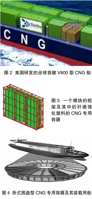 臥式圓盤型。臥式圓盤型是加拿大研發(fā)的 Coselle,每個(gè)圓盤直徑為15~20m,高 2.5~4.5m,重約 550t,圖 2 美國研發(fā)的全球首艘 V800 型 CNG 船圖 3 一個(gè)模塊的框架及其中的纖維強(qiáng)化塑料的 CNG 專用容器圖 4 臥式園盤型 CNG 專用容器及其裝載用船16km 長, 可 裝 載 約 8.495×10 4 m 3 ,見圖 4 所示。臥式圓盤型 CNG 專用容器的優(yōu)點(diǎn)包括:運(yùn)量多變,Coselle 數(shù)量不同時(shí),運(yùn)量差異較大,通過改變船只數(shù)量即可改變運(yùn)量,還可采用改變氣體壓力來改變單船運(yùn)量;建造方便,用 Coselle 儲(chǔ)氣容器的 CNG 運(yùn)輸船,基本上都是由標(biāo)準(zhǔn)的散貨船改建而成,普通造船廠即可建造,成本可大大降低;裝卸簡便,大直徑管盤大大減少了裝卸接頭的數(shù)量,從而使船的裝卸非常簡便。