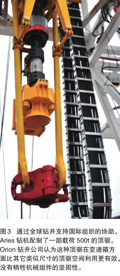 Orion 鉆 井 公 司 較 早 一 代 的 Gemini 鉆機面臨的大多數(shù)挑戰(zhàn)之 一是 500t 頂驅(qū)問題,在阿巴拉契亞 地區(qū)鉆井作業(yè)的鉆機搬遷很難,搬 遷效率低。Orion 鉆井公司最終通 過全球鉆井支持國際組織(GDS) 為 Aries 鉆 機 選 擇 了 一 款 額 定 載 荷 500t 的 頂 驅(qū)( 如 圖 3 所 示)。 Schellenberg 先生說,頂驅(qū)已占去 了設(shè)備的整體空間,Orion 鉆井公 司認為全球鉆井支持國際組織幫助 選定的頂驅(qū)在設(shè)備空間利用方面更 有效, 沒有犧牲機械組件的堅固性, 這在保持鉆機輕便和靈活性方面給 了我們一個巨大優(yōu)勢,同時,還給 予我們的顧客需要設(shè)備正常運轉(zhuǎn)的 動力。Schellenberg 先生補充說: “顧客想要更高的扭矩,但他們也 想要頂驅(qū)更輕便,能在較差的路況 下搬遷或移動,不需要特殊的許可 或批準。”