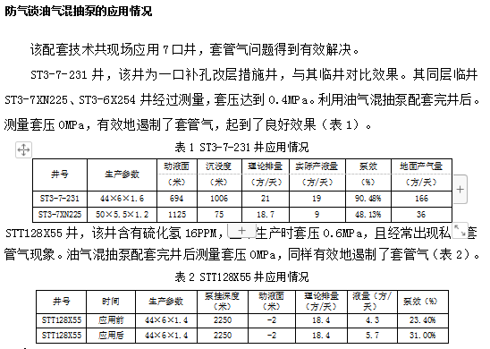 有效解決。油氣混抽泵配套技術(shù),從地 層、井筒入手,從源頭遏制了套 管氣的產(chǎn)生,從根本上有效解決 了套管氣安全環(huán)保問題,意義重 大。 油氣混抽泵配套技術(shù)可以滿 足地面氣體 <500 方 / 天產(chǎn)氣量 的油井正常生產(chǎn),而不產(chǎn)生氣鎖。 對于套壓 >1MPa,且地面 氣體 <500 方 / 天的油井油氣混 抽泵配套技術(shù)可以有效解決其套 管氣問題,并改善其供液情況, 具有較大的應(yīng)用前景和推廣價值。