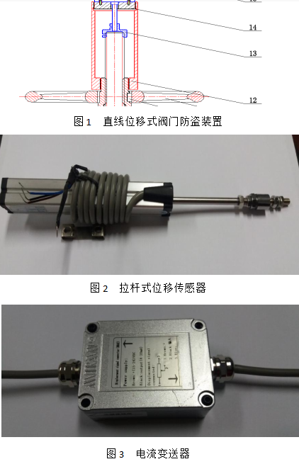 直線位移式閥門報警裝置:直線位移式閥門報警裝置結構如圖1所示,在原閥門零件基礎上繼續(xù)標號。圖中,12為外殼、13為轉接頭、14為連接法蘭盤,15為位移傳感器。外殼取代原來的并帽,既起到固定手輪的作用,又起到支撐位移傳感器的作用。由于閥門完全關閉時,絲杠仍有一小部分露在銅螺母的外面,轉接頭就套在露出的這一小部分上,通過緊定螺釘與絲杠固定在一起,另一端與位移傳感器的拉桿相連。位移傳感器通過連接法蘭盤與外殼相連。由圖可以看出,轉動手輪,絲杠移動,帶動拉桿移動產生位移信號,傳至RTU進行報警;旋轉外殼(標號12),外殼會向上移動從而帶動位移傳感器外殼移動,從而產生位移信號,同理,其它拆卸方法都會產生報警信號;如果,試圖旋轉手輪的同時,旋轉外殼(12)來消除位移傳感器外殼與拉桿的相對運動,需要相當平穩(wěn)的操作和成比例的轉動操作,這在不知防盜裝置工作原理和螺紋螺距的情況下很難做到。圖2為拉桿式直線位移傳感器的實物圖;圖3為4-20mA電流變送器的實物圖。
