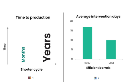 重新審視成熟油田的生產(chǎn)還有助于提高可持續(xù)性的開(kāi)采。開(kāi)發(fā)一個(gè)新油田需要勘探、鉆井施工、一個(gè)鉆井平臺(tái)和其他生產(chǎn)設(shè)施,所有這些都會(huì)增加運(yùn)營(yíng)過(guò)程中的碳排放。通常,成熟的油田由于可以重復(fù)利用現(xiàn)有基礎(chǔ)設(shè)施以及可能的、經(jīng)過(guò)時(shí)間優(yōu)化的更高效的開(kāi)采方法,施工導(dǎo)致的碳排放通常會(huì)較低,見(jiàn)圖3(油井干預(yù)在顯著降低二氧化碳排放的情況下提高了油氣產(chǎn)量)。