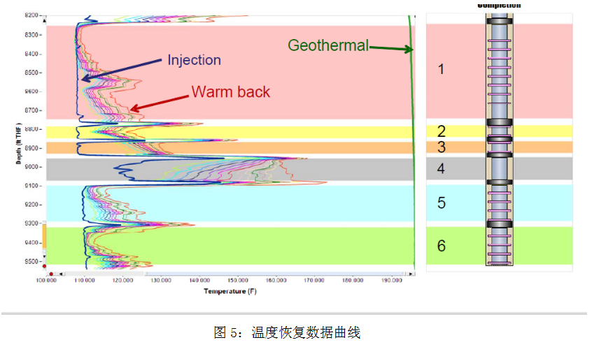 在注入一段時間后,關井以確定注入性分布,并確認膨脹封隔器的隔離區(qū)域及其完整性。層段1的頂部,層段5和層段6溫度都在緩慢地回升,表明這些間隔注入量較多。