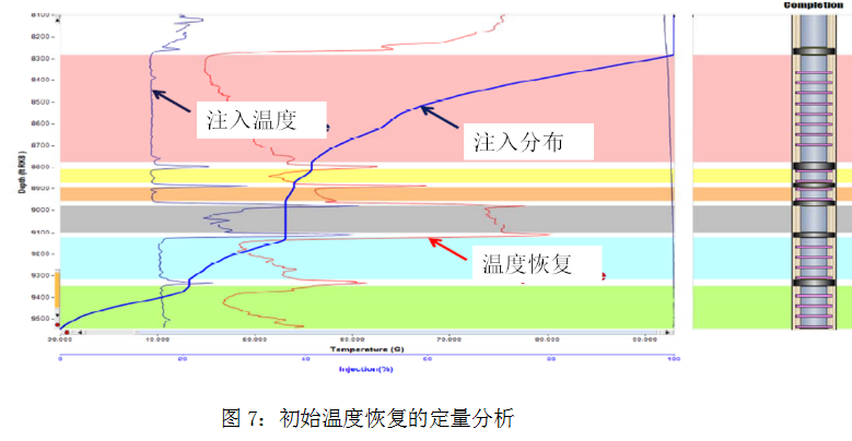 在ICD完井后,該井于2009年8月進行注入。在初始注入速率為8.4 MBPD時進行了測試。從初始注入溫度曲線(圖5中的藍色曲線)中,可獲得粗略定量的注入信息。該數(shù)據(jù)顯示注入溫度一直下降至到趾端,與地溫梯度相比,注入溫度低90°F,因此表明注入水已達到井底。后續(xù)將需要進行溫度恢復測試進行定量分析。