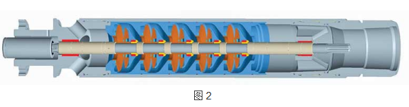 貝克休斯與這家石油公司合作,開發(fā)了一個既能承受高研磨砂、又能減少修井作業(yè)和增加產(chǎn)量的舉升系統(tǒng)。方案包括安裝一個每一級套筒和襯套的凸緣部位加工有耐磨碳化鎢的電潛泵,這樣能降低徑向磨損和下推力,見圖2。