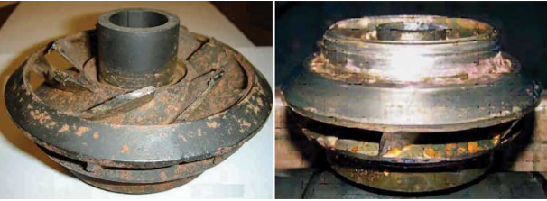 改進后的電潛泵經(jīng)受住了井下高磨損環(huán)境。運行時間增加至644天,相比非耐磨電潛泵的工作壽命增加了800%,見圖3。沒有耐磨組件保護的葉輪,僅僅運行了110天后,其裙環(huán)和入口一側(cè)的下護罩部位呈現(xiàn)出有明顯的磨損(左圖)。極限設計的葉輪在運行644天后呈現(xiàn)出最小的磨損(右圖)。該方案將石油公司的電潛泵舉升成本從每桶37美元降低到了低于每桶2美元,采油成本得到了大幅降低。電潛泵內(nèi)的耐磨插件能幫助保護泵的內(nèi)部免受或減輕磨損。在電潛泵和碳鋼油管的外表面,高固體顆粒會導致其明顯腐蝕。這種情況下,使用緩蝕劑是一種行之有效的方法。