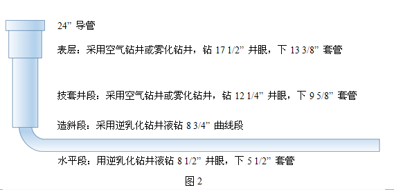 一口典型的超長(zhǎng)水平段的井,鉆井設(shè)計(jì)為:表層導(dǎo)管 + 3段套管結(jié)構(gòu),見圖2。預(yù)下的24”導(dǎo)管深度約36m;17 1/2”表層段采用空氣鉆井或霧化鉆井,接著下13 3/8”套管后固井,該層套管用來保護(hù)淡水沙巖層;12 1/4”技套井段也采用空氣鉆井或霧化鉆井,鉆至要求的井深,然后,該井段下9 5/8”套管至地面后固井;然后,采用逆乳化鉆井液打8 3/4”造斜段和8 1/2”水平段;期間,每個(gè)井段采用專門設(shè)計(jì)的井底鉆具完成各井段目標(biāo)深度的鉆進(jìn)。最后,全程下入5 1/2”套管至地面,固完井后這口井的全部鉆井施工作業(yè)就此已完成。