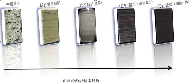 中國陸相致密油主要形成在陸相斷陷湖盆前三角洲及半深湖-深湖相地層中,賦存于優(yōu)質(zhì)烴源巖內(nèi)部或緊鄰優(yōu)質(zhì)烴源巖的頁巖、砂巖、泥灰?guī)r、白云巖等儲層,未經(jīng)過大規(guī)模長距離油氣二次運移。根據(jù)致密油儲層與優(yōu)質(zhì)烴源巖的距離遠(yuǎn)近和油氣二次運移的規(guī)模,中國陸相油氣藏可以劃分為常規(guī)儲層、低孔低滲儲層、近源致密儲層、有一定厚度的薄互層源內(nèi)致密儲層(源儲共生頁巖儲層)和紋層程度薄互層源內(nèi)致密儲層(源儲一體頁巖儲層)。隨著與優(yōu)質(zhì)烴源巖的距離越來越近,地層越來越致密(見圖1)。具體巖石物理特征表現(xiàn)為巖性越來越復(fù)雜、顆粒越來越細(xì)、薄互層程度越來越強(qiáng)、孔隙度越來越小、孔隙結(jié)構(gòu)越來越復(fù)雜、滲透率越來越低、孔滲關(guān)系越來越無規(guī)律,地層評價的難度越來越大。