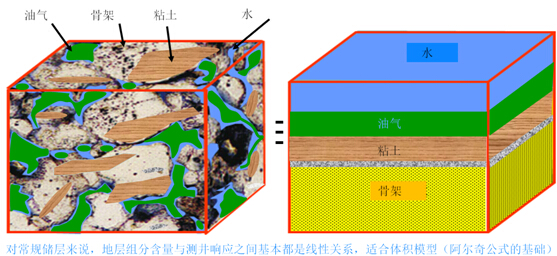測井和數(shù)據(jù)解釋評價技術(shù)是致密油儲層識別、定性和定量評價儲層巖石物理參數(shù)的最直接和關(guān)鍵技術(shù)之一。但目前針對中國陸相致密油的測井及地層評價技術(shù)還處在發(fā)展階段,還不完全成熟,主要還在采用常規(guī)儲層和海相頁巖氣儲層的測井和解釋方法和思路,急需要在測井和解釋模型方面有所創(chuàng)新。這里首先討論一下常規(guī)儲層的地層評價技術(shù)和解釋模型在非常規(guī)儲層評價中的局限性,從而提出發(fā)展和創(chuàng)新針對陸相致密油儲層的測井和評價新技術(shù)的必要性。常規(guī)儲層的測井技術(shù)主要是采用傳統(tǒng)“三組合“測井來測量和表征地層組分的巖石物理特征,其中自然伽馬測井(自然伽馬能譜測井)、自然電位測井和井徑數(shù)據(jù)主要用于泥質(zhì)含量計算和儲層識別;密度測井、中子測井和聲波測井?dāng)?shù)據(jù)主要用于孔隙度計算和巖性識別;感應(yīng)測井或側(cè)向測井?dāng)?shù)據(jù)主要用于含水飽和度計算和含油性識別?;趥鹘y(tǒng)”三組合“測井?dāng)?shù)據(jù)的地層評價解釋模型是經(jīng)典的體積模型和阿爾奇公式(見圖2)。由于常規(guī)儲層的巖性相對簡單、孔隙度大且孔隙結(jié)構(gòu)相對均質(zhì)、孔滲關(guān)系基本滿足達(dá)西定律,傳統(tǒng)的”三組合“測井曲線與常規(guī)儲層的地層礦物組分和孔隙流體之間的響應(yīng)關(guān)系基本是線性規(guī)律,阿爾奇公式也基本滿足條件,可以有效地滿足常規(guī)儲層定性和定量評價的要求。