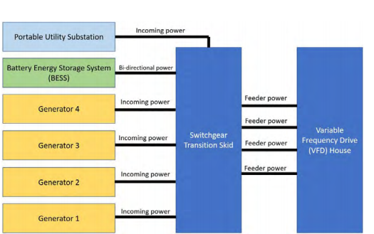 GridAssist系統(tǒng)中的便攜式變電站需先將公用電網(wǎng)輸送來的線路電壓降低,再將電力輸送至過渡撬裝設(shè)備。該撬裝設(shè)備位于發(fā)電機(jī)、電池與變頻驅(qū)動(dòng)(VFD)柜之間——其中,變頻驅(qū)動(dòng)柜負(fù)責(zé)控制鉆井平臺(tái)各設(shè)備(如泥漿泵、絞車、頂驅(qū))所用電動(dòng)機(jī)的轉(zhuǎn)速與功率輸出。