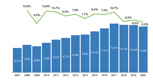 從長(zhǎng)遠(yuǎn)來(lái)看,2007 年至 2019 年期間,俄羅斯的 MWD 作業(yè)數(shù)量增加了 1.94 倍,從 6216 個(gè)工作崗位增加到 12046 個(gè)工作崗位,年均增長(zhǎng)率為 5.7%(見(jiàn)圖 2)。2020 年,MWD 的年度就業(yè)人數(shù)與上一年相比減少了 3.2%,延續(xù)了 2018-2019 年的趨勢(shì),與 2019 年相比減少2.4%,主要是由于定向井?dāng)?shù)量減少2.4%,水平井?dāng)?shù)量減少5.7%。從 2007 年到 2020 年,MWD 作業(yè)數(shù)量增加了 5449 個(gè),增加的原因是需要 MWD 服務(wù)的水平井、定向井和側(cè)鉆井?dāng)?shù)量增加,其中水平井增加了 3015 口,定向井增加了 1118 口,側(cè)鉆作業(yè)增加了 2324 口。