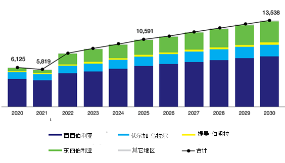在預(yù)測(cè)的 MWD 和 LWD 操作以及動(dòng)力馬達(dá)和旋轉(zhuǎn)導(dǎo)向服務(wù)的樂(lè)觀情景中,是基于預(yù)測(cè)石油產(chǎn)量的樂(lè)觀情景。它假設(shè)未來(lái)幾年石油需求的復(fù)蘇將更快,因此俄羅斯將不那么嚴(yán)格地遵守任何生產(chǎn)限制。該情景預(yù)測(cè),到 2030 年,MWD 運(yùn)營(yíng)將比 2020 年增長(zhǎng) 61.9%,總計(jì) 18885 個(gè)工作崗位。 從2021年到2030年,這些業(yè)務(wù)數(shù)量的年均增長(zhǎng)率將達(dá)到4.9%。2021-2030 年 MWD 作業(yè)數(shù)量的增長(zhǎng)是基于已投入使用的水平井?dāng)?shù)量的增長(zhǎng),以及側(cè)鉆作業(yè)數(shù)量的增加以及斜井?dāng)?shù)量的減少。 在區(qū)域上,西西伯利亞仍將是 MWD 操作占主導(dǎo)地位的主要區(qū)域,就像在中立情景中一樣,而東西伯利亞將位居第二。MWD 作業(yè)數(shù)量的增加是基于東西伯利亞增加了 44% 和西西伯利亞增加了 39%。就像在中性情景中一樣,在大部分地區(qū),MWD 作業(yè)數(shù)量的變化是由水平井的增加和側(cè)鉆作業(yè)的增加引起的。2030年MWD作業(yè)總量中,西西伯利亞和東西伯利亞占76%,分別占55%和21%。