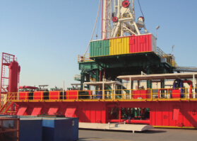 該系統(tǒng)包括 3 個(gè)單獨(dú)的移動(dòng)系 統(tǒng)。鉆井模塊、鉆井液設(shè)備模塊和 動(dòng)力模塊均有單獨(dú)的、專(zhuān)用的移動(dòng) 系統(tǒng),彼此單獨(dú)操作。這種布局使 得鉆臺(tái)上的鉆井液系統(tǒng)和動(dòng)力系統(tǒng) 更容易跟隨井架和井架底座移動(dòng), 使得模塊間的相對(duì)位置更靈活,模 塊間距離更短。鉆井模塊包括井架 和井架底座,用 8 個(gè)起重機(jī),在標(biāo) 準(zhǔn)鉆機(jī)沉墊下達(dá)到小于 4kg/cm 2 的 地面壓力(人工島地面承壓)。該 步行系統(tǒng)允許攜帶井架、 井架底座、 滿(mǎn)載的鉆桿盒、以及井架底座附屬 設(shè)備如防噴器關(guān)井單元、上升滑道 和防噴器等作為一個(gè)整體移動(dòng)。泥 漿模塊包括泥漿泵、頁(yè)巖振動(dòng)篩、 節(jié)流管匯和泥漿罐,該步行系統(tǒng)允 許攜帶全部泥漿罐移動(dòng)到新井,可 以節(jié)省大量時(shí)間。