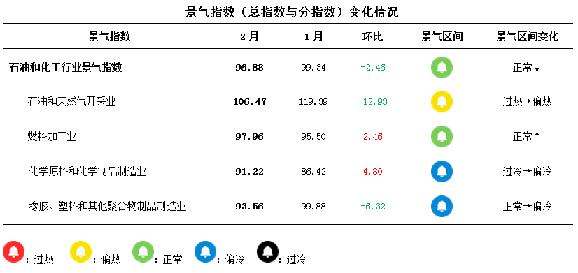 2023年2月石油和化工行業(yè)景氣指數(shù)回調(diào),降至96.88,較2023年1月下降2.46個(gè)百分點(diǎn),仍處正常區(qū)間;較2022年2月下降4.46個(gè)百分點(diǎn),降幅延續(xù)收窄趨勢(shì)。