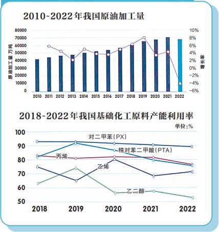 2022年面對(duì)世界動(dòng)蕩加劇、全球通脹持續(xù)蔓延、經(jīng)濟(jì)復(fù)蘇動(dòng)力減弱等復(fù)雜嚴(yán)峻局面,石油和化工行業(yè)持續(xù)推動(dòng)創(chuàng)新驅(qū)動(dòng)和綠色轉(zhuǎn)型,行業(yè)運(yùn)行質(zhì)量進(jìn)一步提高,各項(xiàng)經(jīng)濟(jì)指標(biāo)超出預(yù)期,為國(guó)家能源安全和經(jīng)濟(jì)社會(huì)發(fā)展提供了堅(jiān)實(shí)保障。同時(shí),受宏觀經(jīng)濟(jì)放緩、能源價(jià)格上漲、疫情超預(yù)期反復(fù)等因素影響,房地產(chǎn)、汽車等主要下游市場(chǎng)需求有所下滑,行業(yè)內(nèi)部運(yùn)行分化加劇。具體表現(xiàn)在: