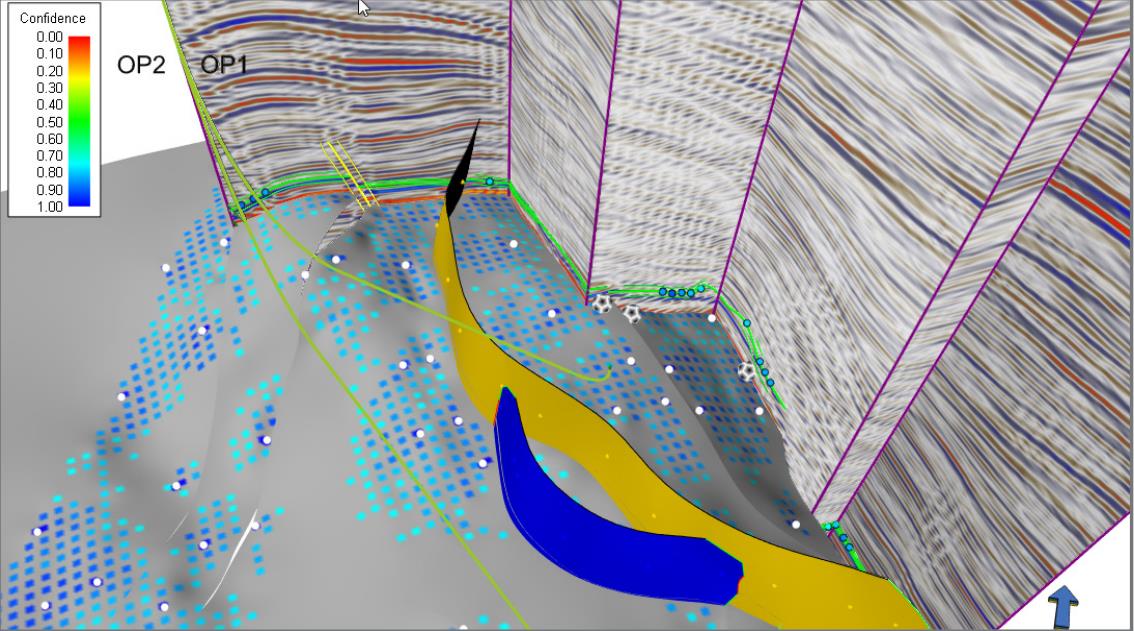 圖4 用復(fù)合地震圍欄上解釋斷層和層位。相交的斷層顯示斷層發(fā)展為捕獲的不確定性。
